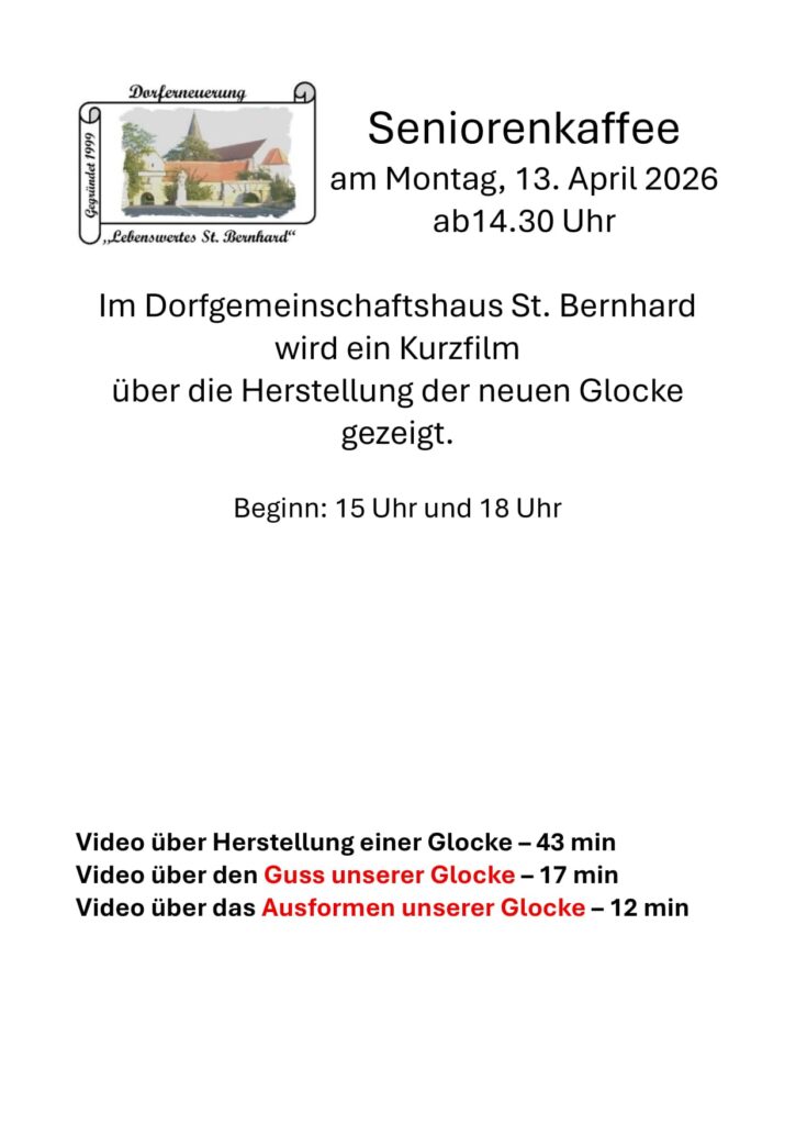 Beim Seniorenkaffee steht diesmal ein besonderes Thema im Mittelpunkt: die neue Totenglocke von St. Bernhard, die am Muttertag ihre Weihe erhält.