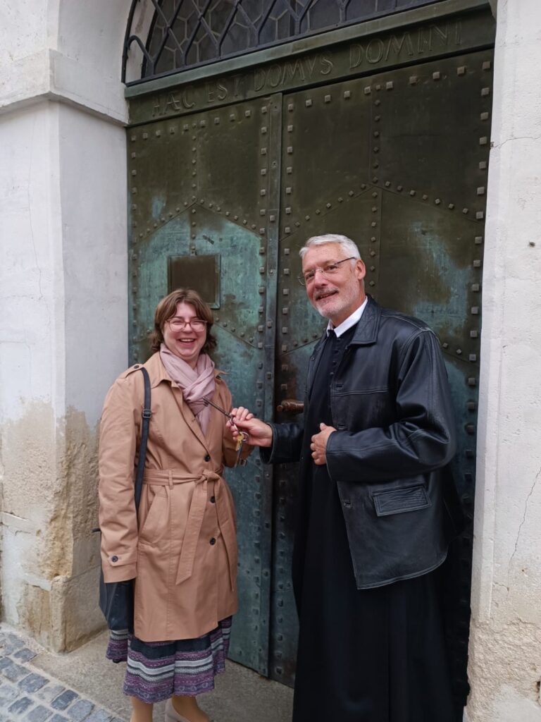 Auf dem Foto übergibt P. Albert ihr den Kirchenschlüssel – als Zeichen des Vertrauens und der neuen Aufgabe.