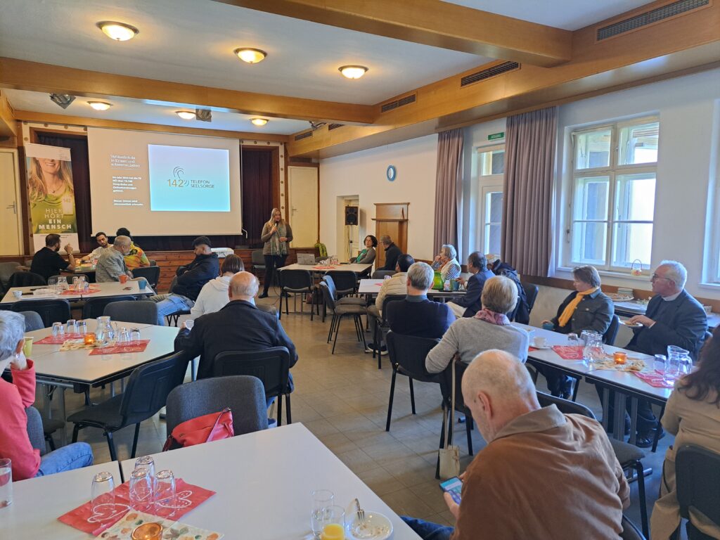 Die Psychologin Ama Lovenson stellte für alle TeilnehmerInnen des Nachmittags zweisprachig (deutsch – englisch) die Telefonseelsorge in Österreich vor.