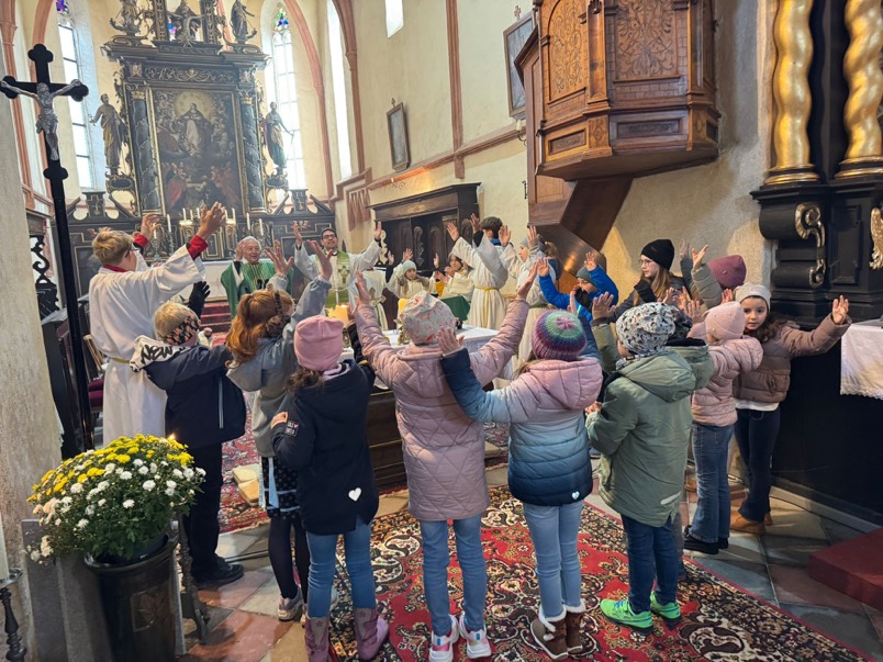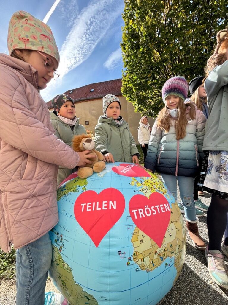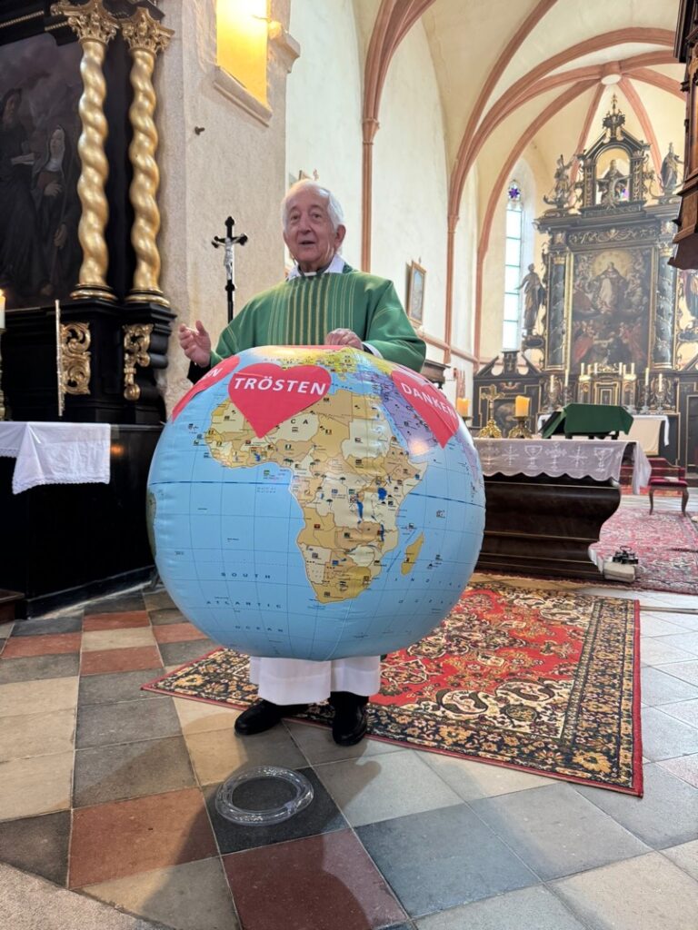 Ein besonderes Highlight der Messe war der Kinderchor, der die Feier musikalisch umrahmte und eine fröhliche, hoffnungsvolle Atmosphäre schuf. Auch inhaltlich trugen die Kinder zur Messe bei: In einer berührenden Aktion machten sie sich Gedanken darüber, wie man Gottes Liebe heute sichtbar machen kann. Sie klebten Herzsticker mit Worten wie teilen, helfen oder trösten auf eine Weltkugel – ein starkes Symbol dafür, wie Liebe die Welt „verarzten“ kann.