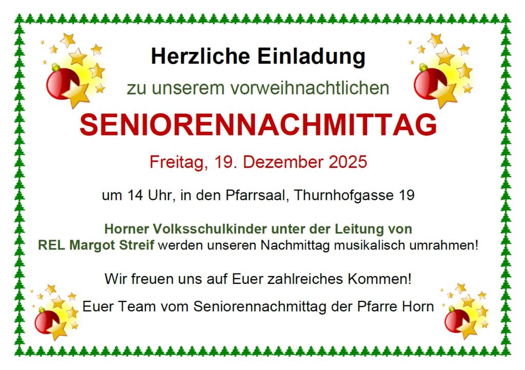 Vorweihnachtlicher Seniorennachmittag Veröffentlicht am 16. Dezember 2025 von Pfarre Horn Das Team des Seniorennachmittages freut sich auf Ihr/ Euer kommen!!!