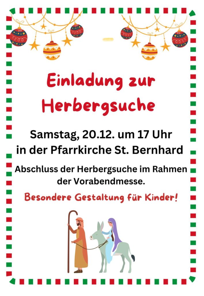 Auch in diesem Advent laden wir herzlich zur Herbergsuche ein. Maria und Josef sind unterwegs und bitten um Herberge – ein Zeichen für Gemeinschaft, Offenheit und das bewusste Unterwegssein auf Weihnachten hin.