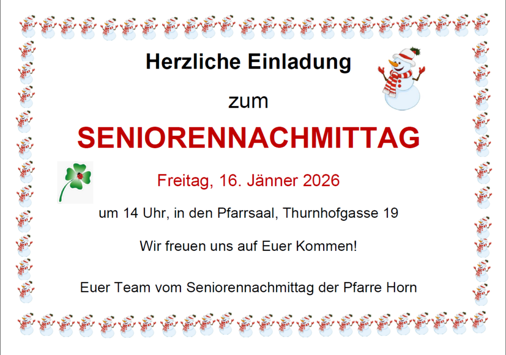 Beliebter Seniorentreff findet wieder statt. Veröffentlicht am 7. Januar 2026 von Pfarre Horn Auch im neuen Jahr gehen die fröhlichen Seniorennachmittage der Pfarre Horn weiter.