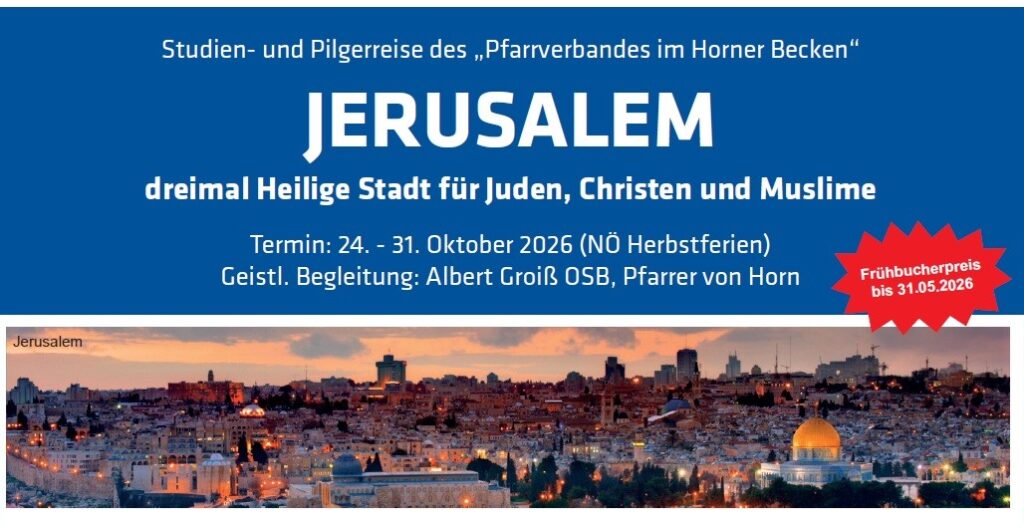 Bei dieser einmaligen Gelegenheit, Jerusalem ausführlich von unten bis oben kennenzulernen – noch dazu im Österreichischen Hospiz als Unterkunft – begleiten Sie P. Albert, der Jerusalem als Student kennenlernen durfte und Rahal Salquin, eine jüdische Konvertitin aus der Schweiz.