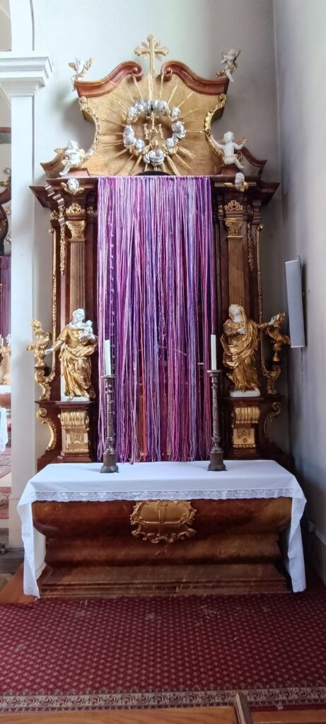 Die Fastentücher sind aus vielen einzelnen Luftmaschenschnüren entstanden. Jede Schnur für sich wirkt zart und unscheinbar – und doch ist jede einzelne unverzichtbar. Erst im Zusammenspiel wird daraus ein großes Ganzes. So wird auf eindrucksvolle Weise sichtbar, was auch unsere Pfarrgemeinde ausmacht: Viele Menschen mit unterschiedlichen Begabungen, Lebenswegen und Erfahrungen bilden gemeinsam eine lebendige Gemeinschaft.