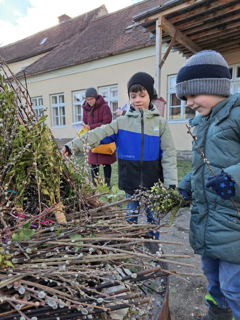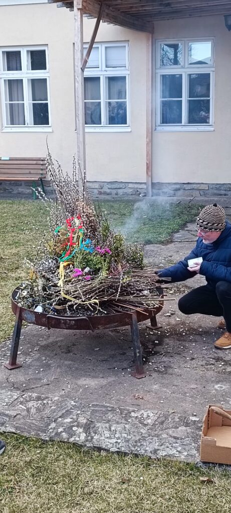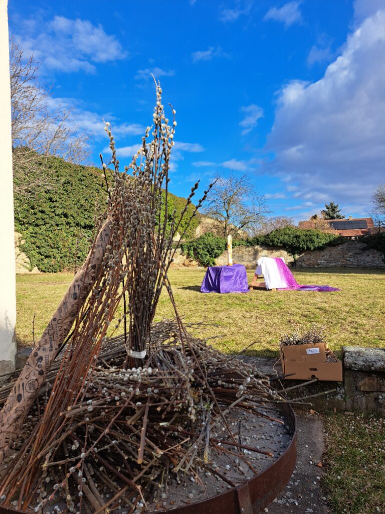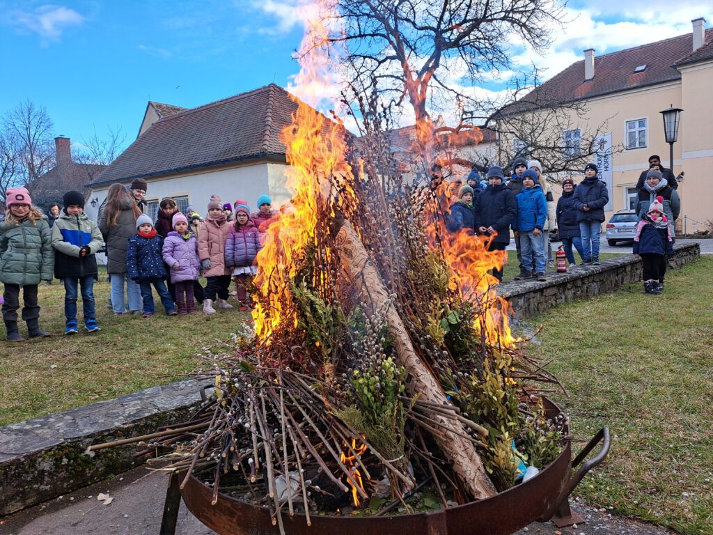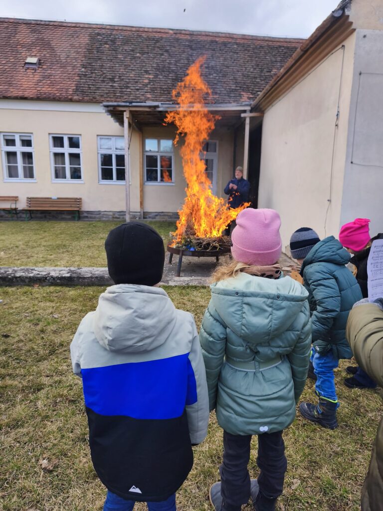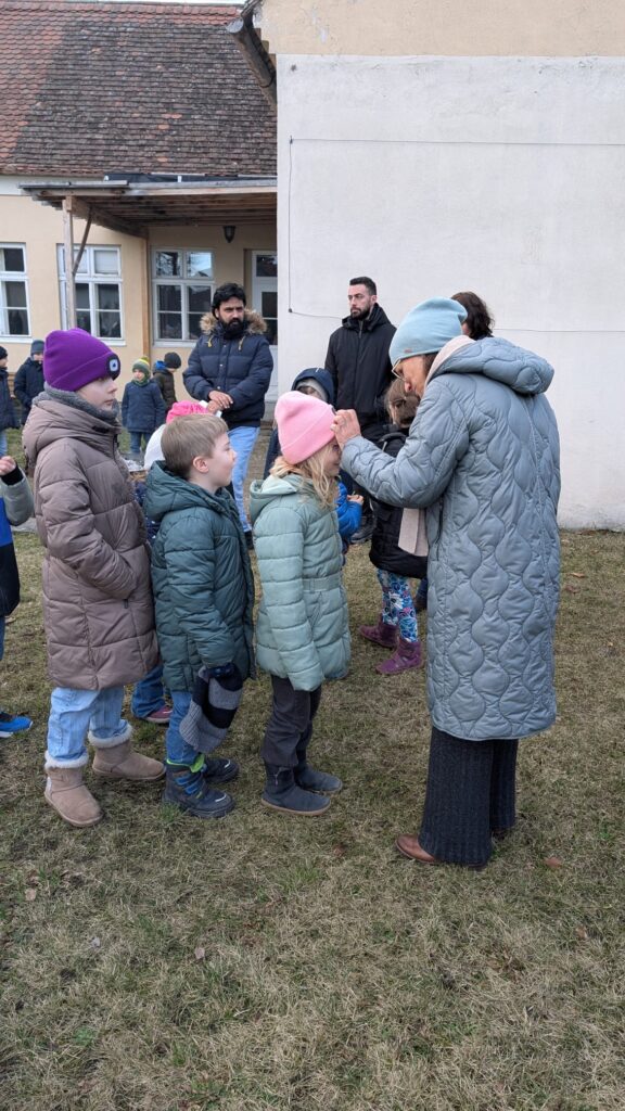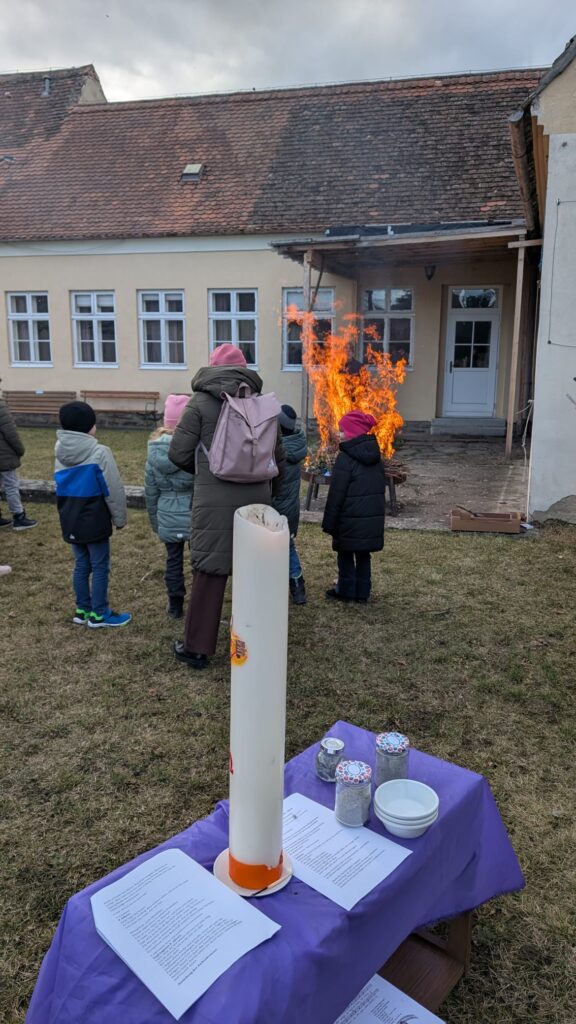 Ein Highlight des Nachmittages war wieder das Verbrennen der Palmzweige vom vergangenen Jahr. Nach ein paar Gedanken zu den neuen Werken der Barmherzigkeit und gemeinsamen Liedern, wurde allen Anwesenden das Aschenkreuz aufgelegt.