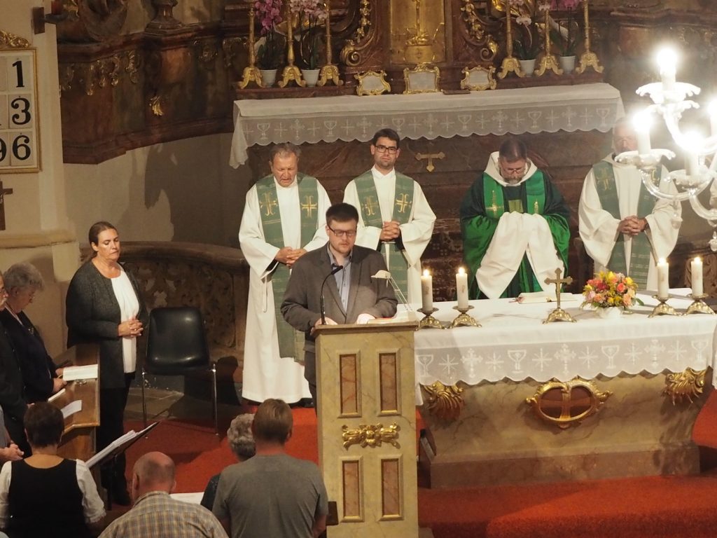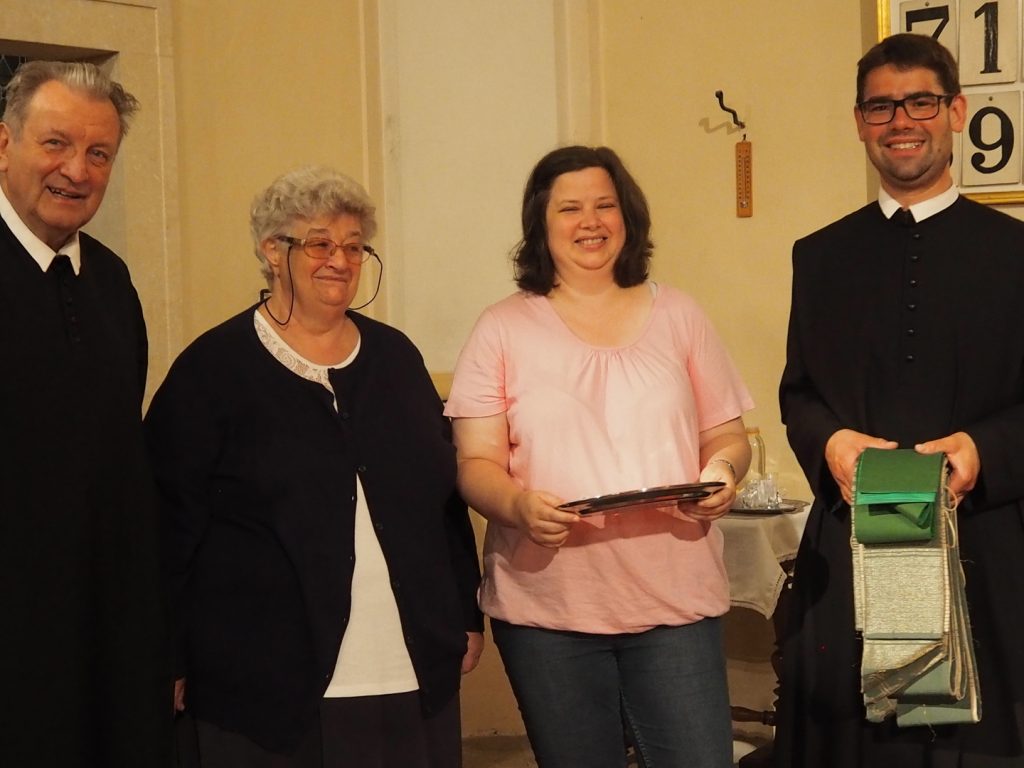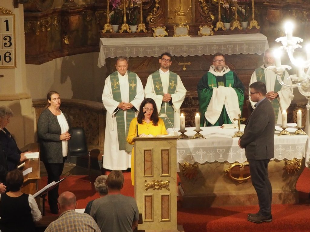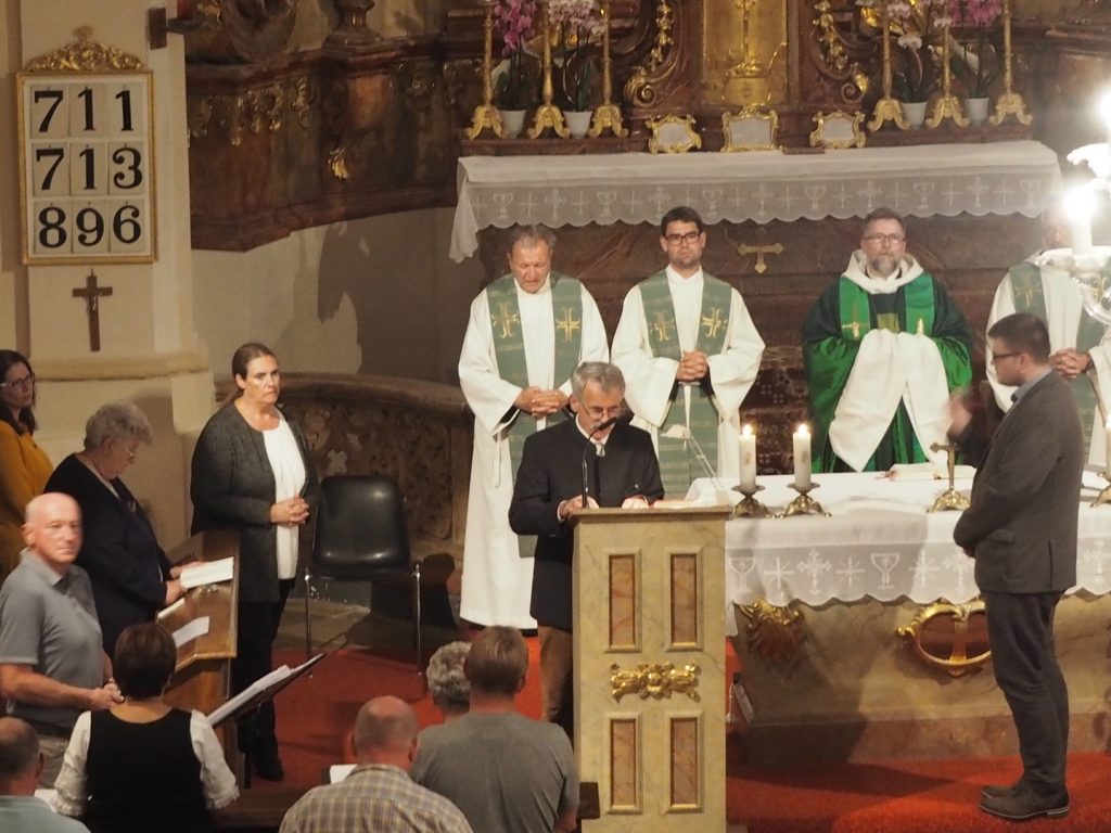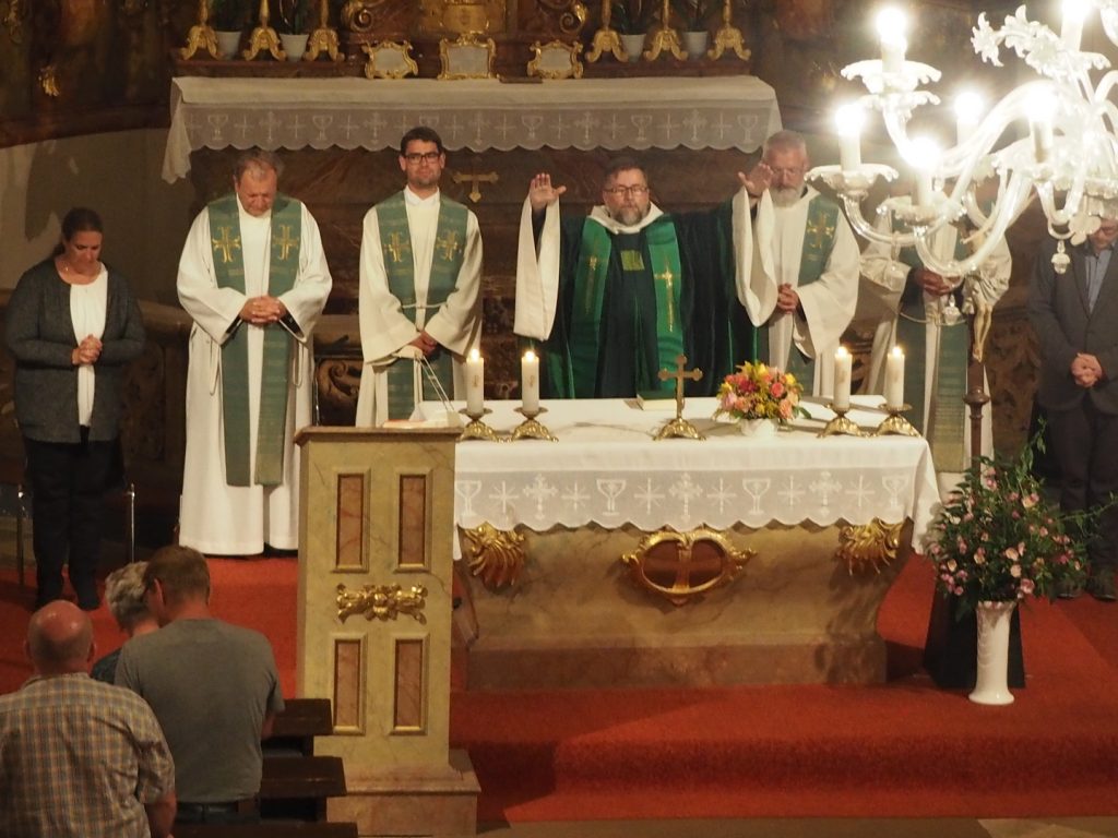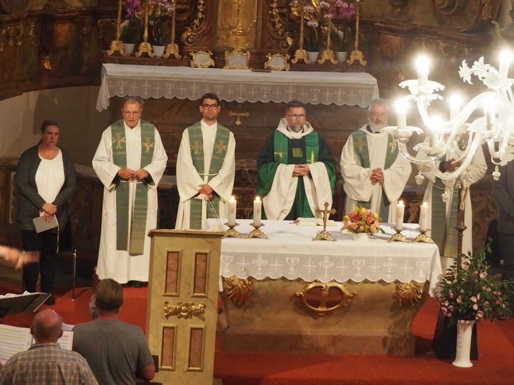 Zum ersten Willkommensgottesdienst im neuen Pfarrverband im Horner Becken lud die Pfarre St. Bernhard ein. Vor der Kirche wurde Pfarrmoderator P. Albert Groiß OSB symbolisch der Schlüssel der Kirche St. Bernhard überreicht. Der Kirchenchor unter der Leitung von Karl Gabler gestaltete den Gottesdienst musikalisch. Dechant P. Michael Hüttl OSB sprach in seiner Predigt davon, dass wir alle, jede Getaufte, jeder Getaufte, dazu berufen sind, hinaus zu gehen und zu helfen, lebendige Pfarrgemeinschaft zu sein, dass wir alle berufen sind, und keiner „hoch“würdig ist, sondern wir alle gleich würdig sind, Gottes Wort zu verkündigen und unsere Mitmenschen dafür zu begeistern. Vor dem Schlusssegen übergab Pfarrmoderator P. Albert Groiß OSB symbolisch den Schlüssel zum Tabernakel an Pfarrvikar P. Clemens Hainzl, der im Pfarrverband für die Pfarre St. Bernhard zuständig ist. P. Clemens gewann die Herzen seiner neuen Pfarrmitglieder mit den Worten: „Ihr braucht keine Angst haben, dass ich mich in der Kirche verstecke, ich komme zu euch – zur Jugend, zur Feuerwehr und zu euch allen!“ Bei der Agape, die der Dorferneuerungsverein und der Pfarrgemeinderat von St. Bernhard vorbereitet hatten, fanden viele Gespräche zwischen den Pfarrmitgliedern und dem Seelsorgeteam statt. Auf ein gutes Miteinander im Pfarrverband freuen sich die Pfarrmitglieder St. Bernhard und das Seelsorgeteam des Pfarrverbandes im Horner Becken.